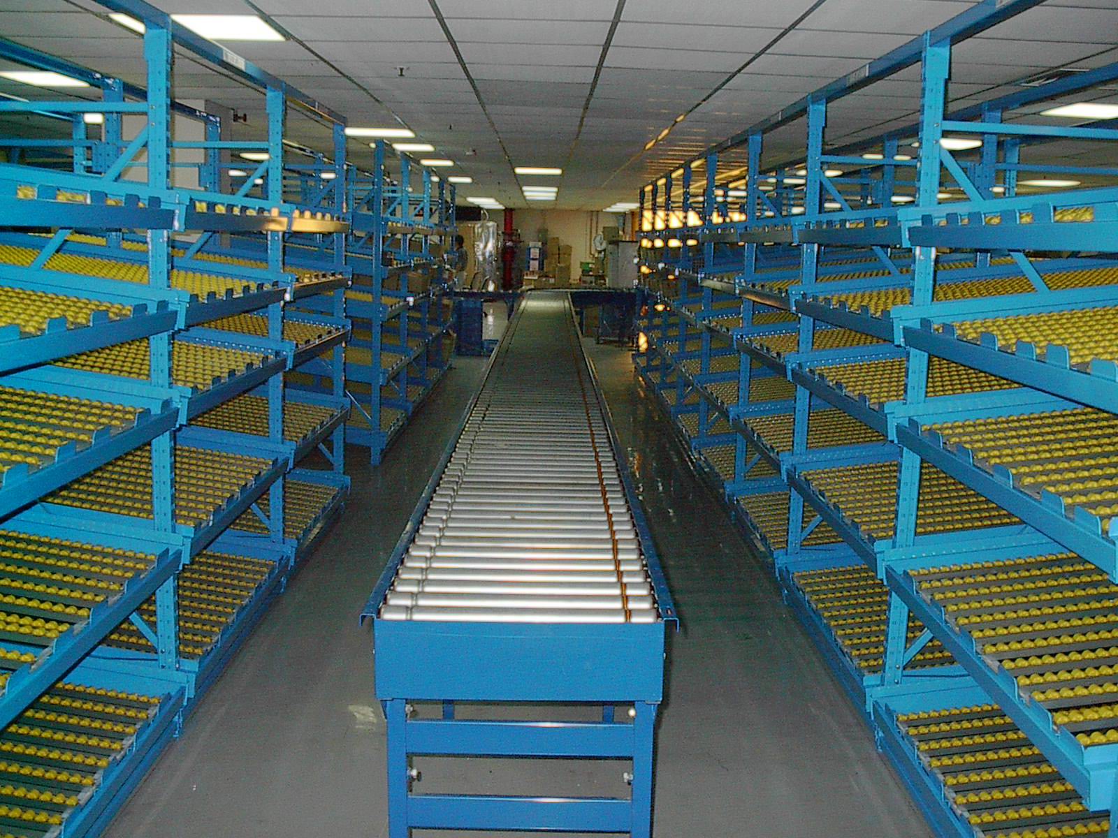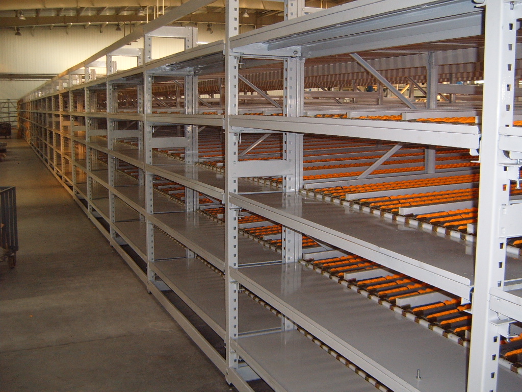 流利式貨架通常由中型橫梁式貨架演變而成,貨架每層前后橫梁之間設(shè)置滾輪式鋁合金或鈑金式流力條,呈一定坡度(30左右)放置。貨物通常為紙包裝或?qū)⒇浳锓庞谒芰现苻D(zhuǎn)箱內(nèi)利用其自重實現(xiàn)貨物的流動和先進(jìn)先出,貨物由小車進(jìn)行運(yùn)送,人工存取,存取方便,單元貨架每層載重量通常在1000KG以內(nèi),貨架高度在2.5米以內(nèi)。適于裝配線兩側(cè)的工序轉(zhuǎn)換、配送中心的揀選作業(yè)等場所,可配以電子標(biāo)簽實現(xiàn)貨物的信息貨管理。